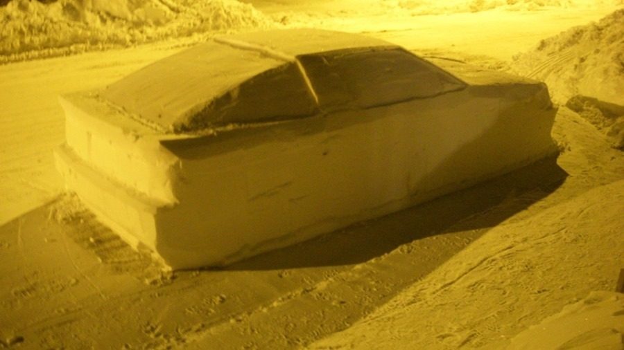 你覺得這雪堆雕塑出來的車到底像不像 Toyota Supra 還是 Delorean DMC-12 呢?