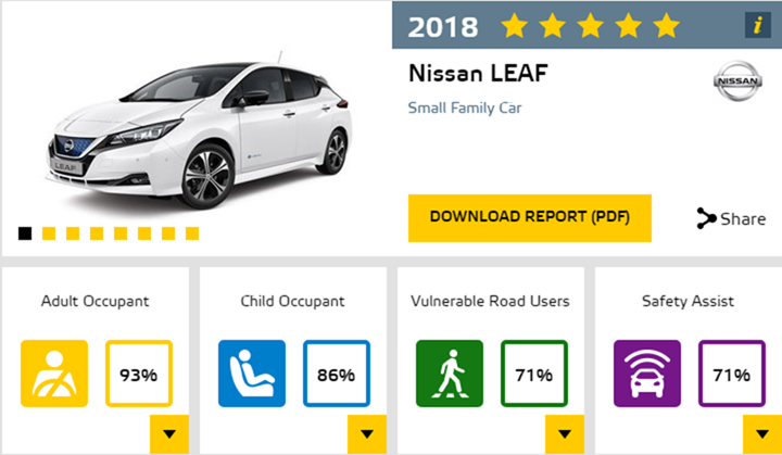 第二代 Nissan Leaf 電動車Euro NCAP 撞擊測試榮獲五顆星安全評價,Leaf 各別的防護成績中,成年乘客防護 93%、兒童乘客防護 86%、行人防護 71%、安全輔助防護 71%,表現十分亮眼。