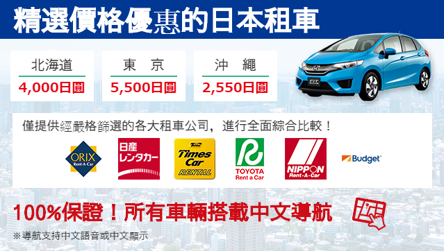 首先可以先上網預訂租車公司、租車日期與車型,有個好用的租車網站 Tabirai 日本租車網,結合了多家日本的租車公司供比較,租車公司包含了 Orix、Times Car、Toyota、Nippon、Budget、日產,而且車載系統都有搭載中文衛星導航,不用怕聽不懂日文,相同車型的價格大多都差不多。