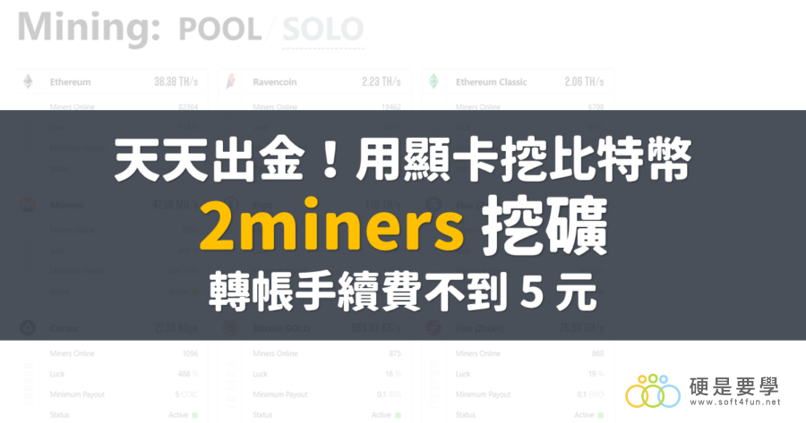 [加密貨幣] 天天出金!2miners 挖礦轉帳手續費不到 5 元,用顯卡就能挖比特幣!