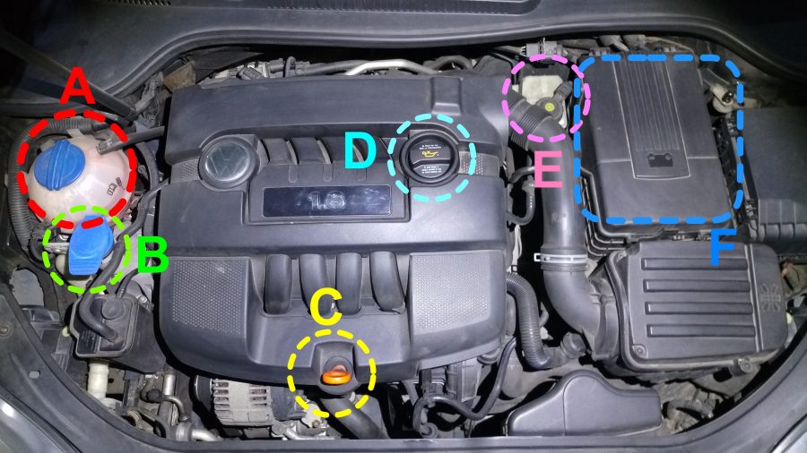 每種車的車主操作手冊,建議車主一般保養的項目大致上都差不多(還是以車主手冊為主),以這台福斯汽車的引擎室為例子,A 為冷卻液也就是水箱水B雨刷水C 引擎機油尺D 引擎機油添加蓋E 煞車油壺F 電瓶,分別來說明。