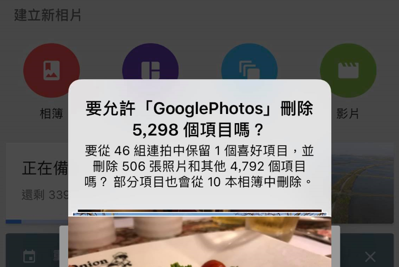 由於硬大是以 iOS 版本作為示範,在刪除照片前 iOS 會再掃描一次刪除的檔案,連拍的部分在 Google 相簿認定上可能是判定為 1 張照片,但 iOS 的認定則是把連拍照片的總數逐張計算進去,因此總共會刪除的照片達 5,298 張。按下【刪除】後系統就會開始刪除照片。Android 系統的操作方式類似。