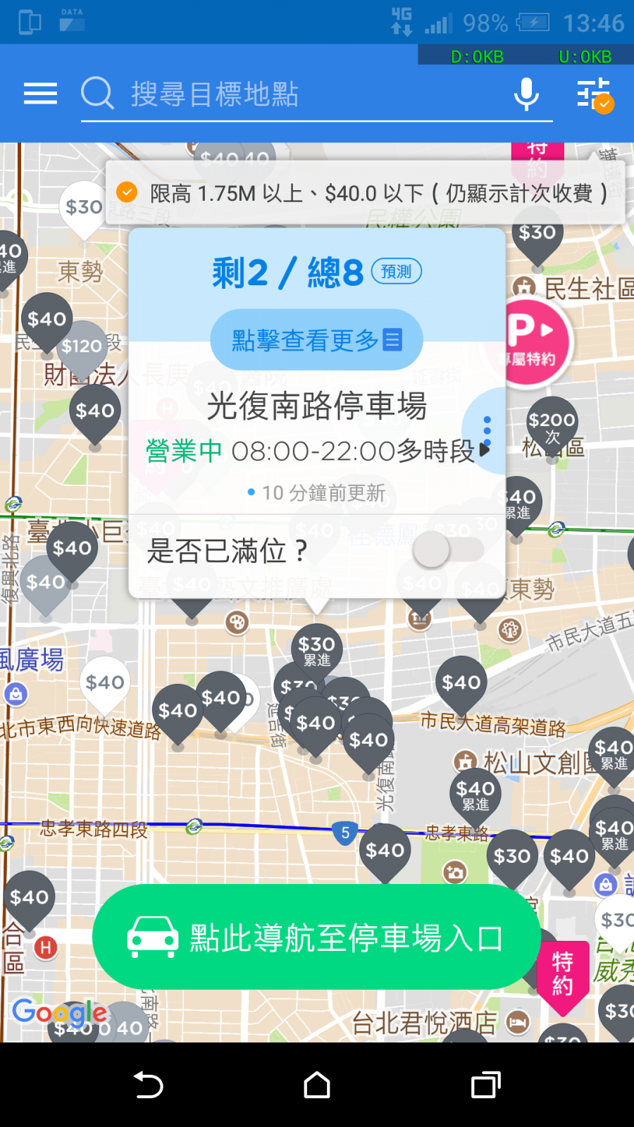 接著就會顯示符合設定條件的停車場,點選任一個停車場就會顯示停車資訊,顯示內容包含剩餘車格、總車格、營業時間與何時更新這停車場的資訊,還可以讓網友回報停車場是否已經額滿,下方還有導航功能(結合 Google Maps 進行導航)。