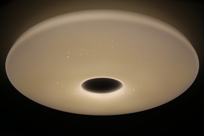 安裝完成後馬上就開始測試,打開智奕吸頂燈後,房間的亮度比之前明亮很多很多,光線預設是暖色光,整個視覺感相當舒服,從燈罩裡面透出來一點一點的光線看起來就像星空一樣,真的很有質感。