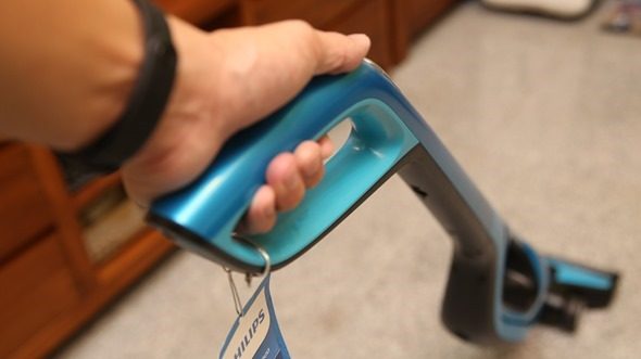 「吸塵」的部分可以分為直立和手持兩種吸塵方式。直立方式的拿法就像使用一般吸塵器一樣,吸地板或吸地毯都OK,吸頭上有輪子可以輕易的在地板上前後左右移動吸塵。