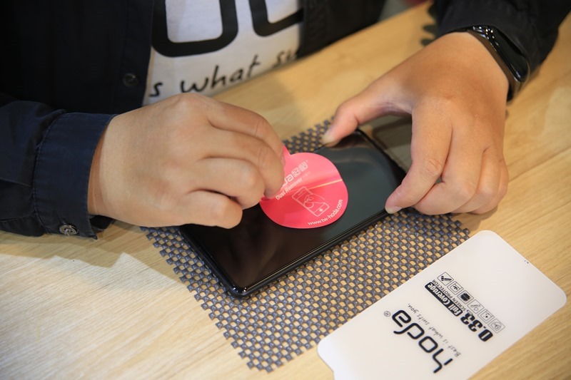 接著拿出除塵貼紙,把螢幕上殘留的灰塵棉絮徹底黏起來。