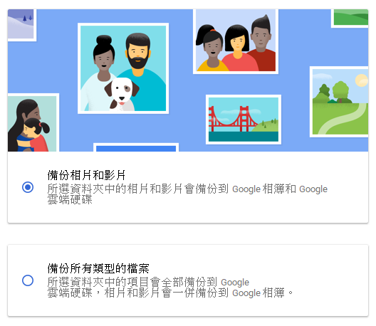 一開始 Backup and Sync 會要求選擇一個備份方式,如果備份檔案包括非照片、影片類的話就選擇第二個(往雲端硬碟備份),照片/影片就選擇第一個(往 Google 相簿備份)。如果你選擇第二個選項只要裡面有包含照片/影片,它還是會自動幫你備份到 Google 相簿的,等於兩邊都會備份。