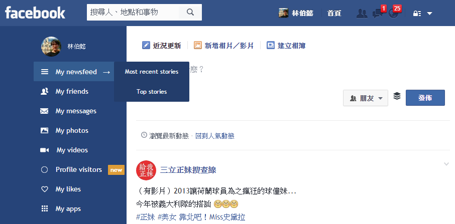 把滑鼠移到選單最上面的 My newsfeed 處可以選擇在塗鴉牆上顯示最新動態(Most recent stories)或人氣動態(Top stories)。