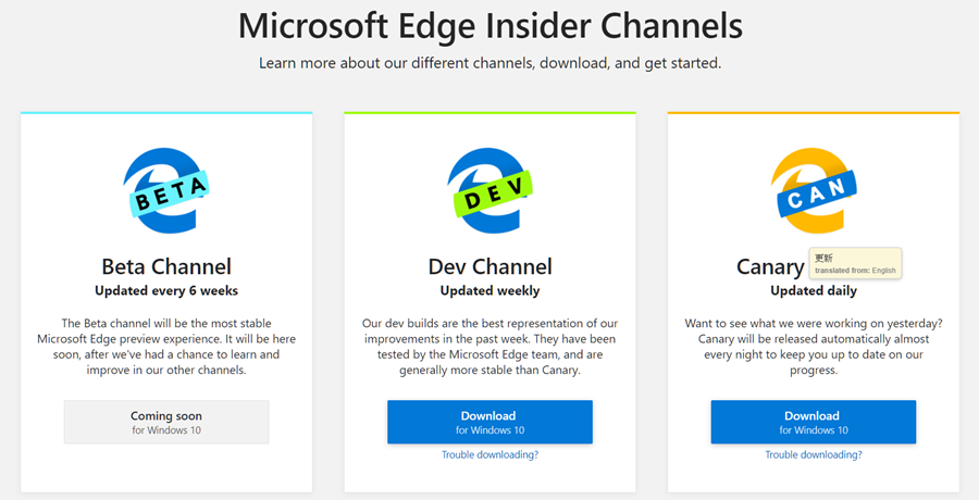 新版的 Edge 瀏覽器可以在 Microsoft Edge Insider 下載 (後面有下載連結),根據目前的規劃共分為 Canary、Dev 及 Beta 三個更新頻道 (Channel),更新週期分別為每日、每周及 6 周,如果您不是開發人員,建議可以使用 Beta 頻道比較穩定,遇到 Bug 的機會也比較少。