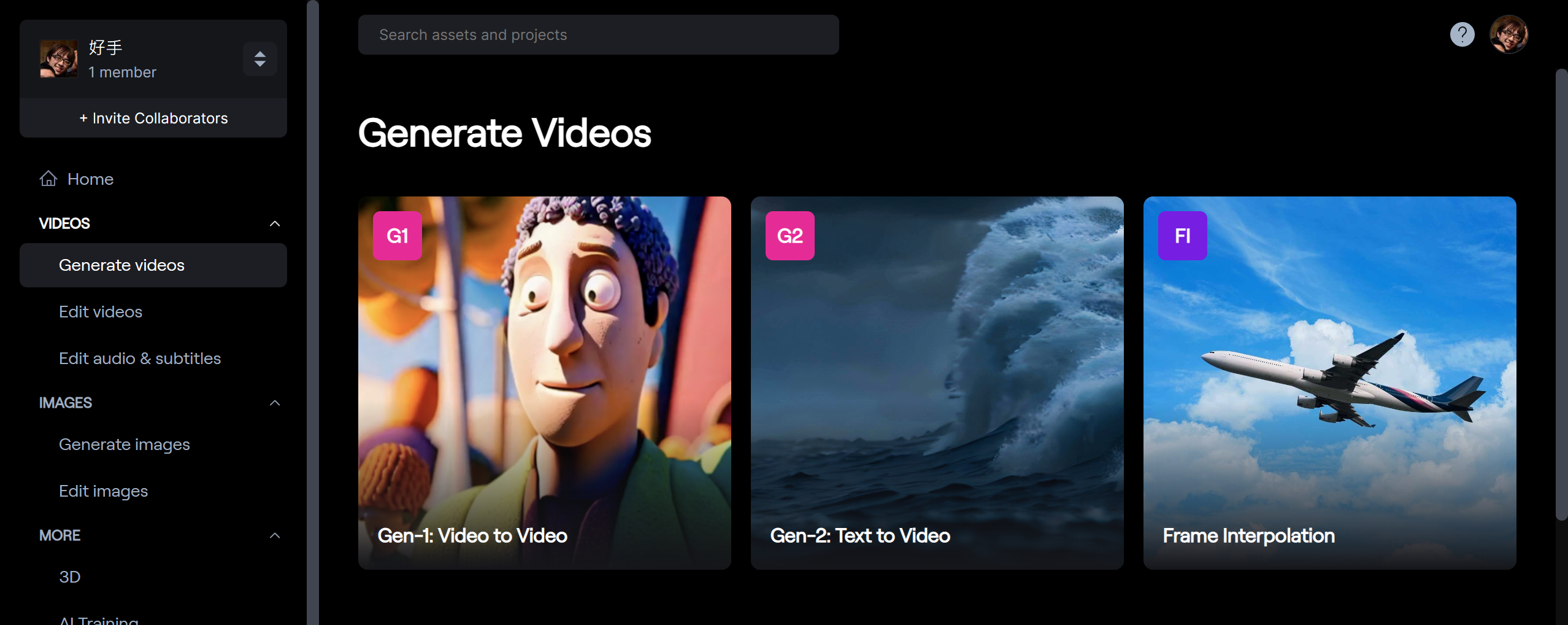 Step 1. 在登入後的主畫面點選「Generate videos」,並點選「Gen-2: Text to Video」,就可以進入 Gen-2 的創作畫面。