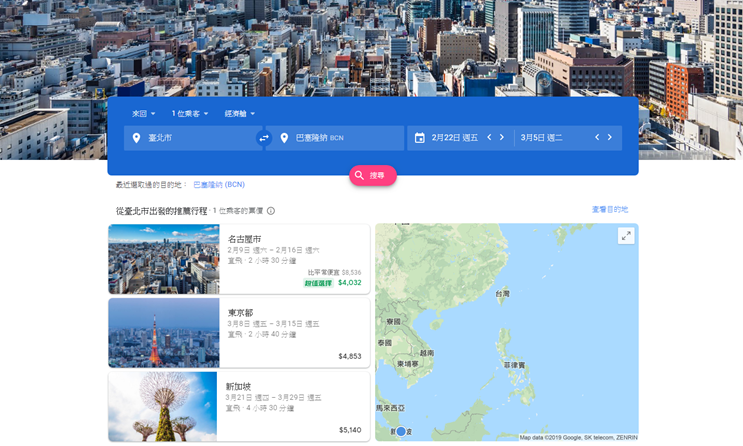 進入 Google 航班首頁會自動推薦幾個熱門行程給我們參考,通常推薦的價格都是比較低的,先看看有沒有正好你在搜尋的,如果沒有就自己選擇吧!