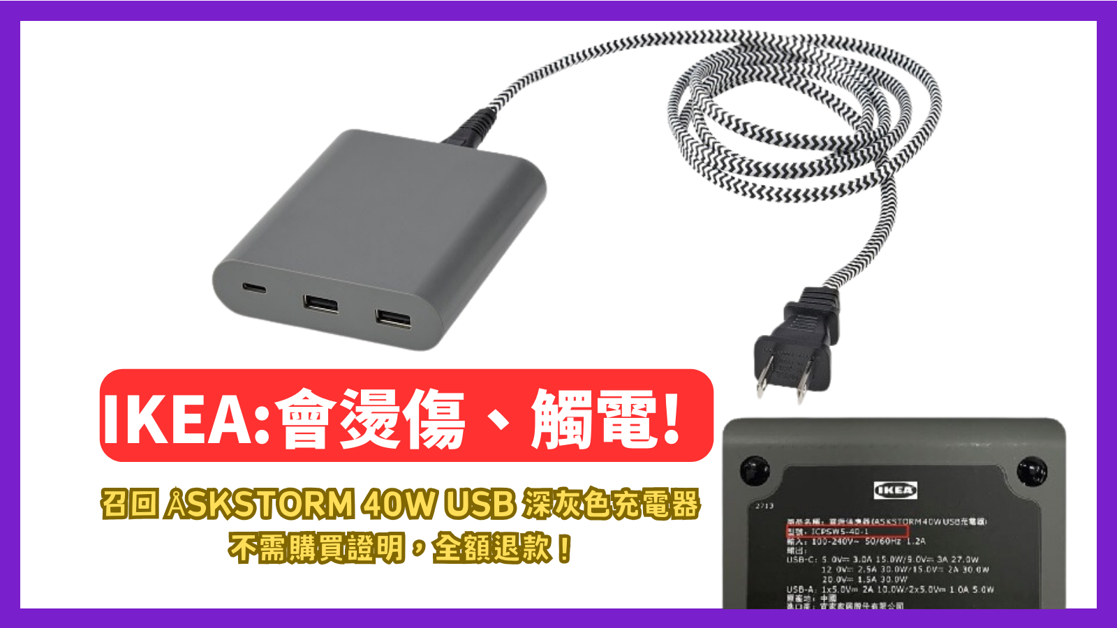 IKEA 最近發出了一則重要的產品召回通知。召回的對象是 ÅSKSTORM 40W USB 深灰色充電器,原因是在長時間使用或反覆彎曲後,該充電器的電線可能會損壞甚至斷裂。這種情況會引發潛在的燙傷和觸電風險,因此為了消費者的安全考慮,IKEA決定進行召回。