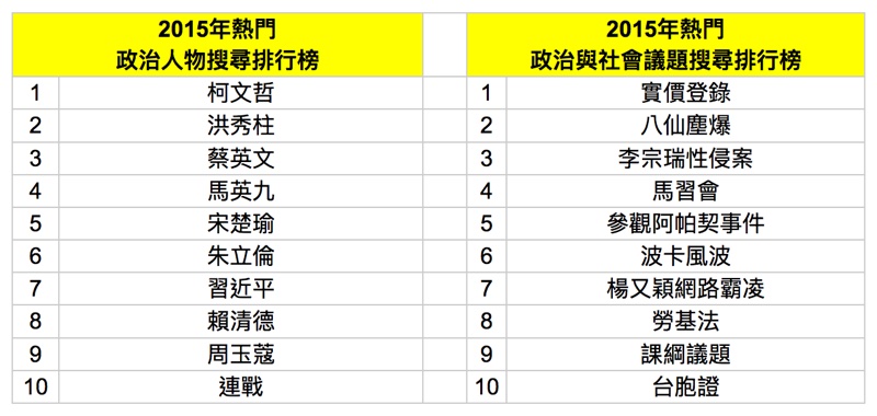 因應明年台灣總統大選,在Google稍早公布的2015年熱門與快速竄紅政治人物、政治及社會議題搜尋排行榜中,有不少熱門搜尋關鍵字與「總統大選」、「換柱」、「馬習會」等議題相關,同時在社會議題方面則以「波卡風波」、「八仙塵爆」、「參觀阿帕契事件」、「楊又穎網路霸凌」、「課綱議題」與「台胞證」等成為熱門搜尋內容。 從政治議題方面來看,由於明年準備迎接台灣總統大選,因此近期展開的…