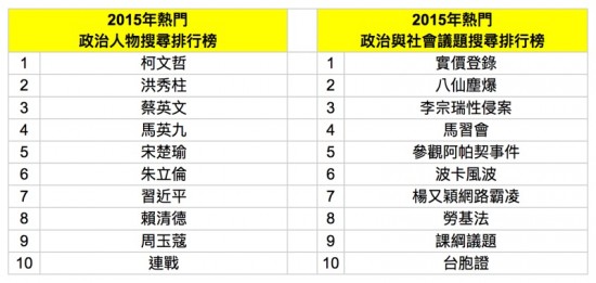 因應明年台灣總統大選,在Google稍早公布的2015年熱門與快速竄紅政治人物、政治及社會議題搜尋排行榜中,有不少熱門搜尋關鍵字與「總統大選」、「換柱」、「馬習會」等議題相關,同時在社會議題方面則以「波卡風波」、「八仙塵爆」、「參觀阿帕契事件」、「楊又穎網路霸凌」、「課綱議題」與「台胞證」等成為熱門搜尋內容。 從政治議題方面來看,由於明年準備迎接台灣總統大選,因此近期展開的…