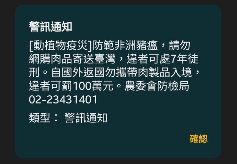 一人一訊息,告訴朋友長輩不要攜帶疫區肉品回國