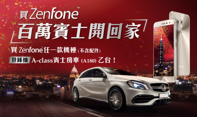 華碩 ZenFone 銷售成績火熱,今天再推出歲末酬賓好禮大放送方案,方案超狂!在 2017/2/1 前要購買任何一款 ZenFone 手機 (包含一、二、三代),並前往官網登錄,就有機會可以獲得價值 150 萬的 BENZ A-Class A180!