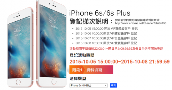 iPhoene 6s/6s Plus 即將在本(10)月9日正式在台灣上市,各家電信的iPhone 6s 預購方案都已陸續出爐,而台灣最多用戶的中華電信也在今天正式展開預購登記,今日下午 15:00 後分 4 波開放 VIP 用戶登記預購。