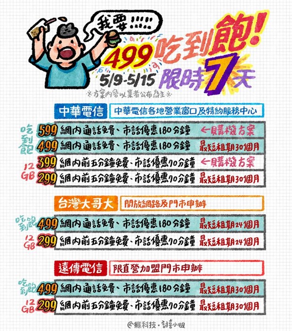 中華電信和各家業者才剛結束軍公教 499 吃到飽方案,中華電信馬上又宣布從 9日~15日限時7天申辦「399/599 全民購機方案」和母親節特選優惠「299/499 犀利通信方案」,不論是新申辦、NP攜碼或是續約都可以申辦,其中 499 方案綁約 30 個月就可享受中華電信的 4G 上網吃到飽、網內通訊免費及網外/市話共180分鐘優惠,方案推出之後許多中華電信門市就擠爆人潮,但如果你還沒搶到的話,再等幾天消化人潮也無妨。