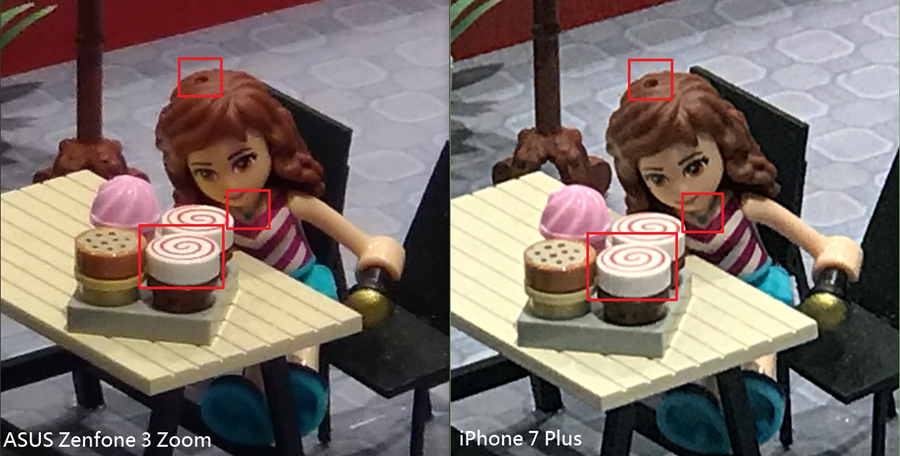 在色彩還原程度上,ASUS Zenfone 3 Zoom 照片所呈現出來的顏色明顯較 iPhone 7 Plus 正確,在圖中髮色的部分可以明顯觀察出。背景灰色的部分,iPhone 7 Plus 所呈現的顏色也比較偏黃,顯示華碩 Zenfone 3 Zoom 的 RGB 感測器對於真實色彩還原的確能讓照片的顏色更接近真實。