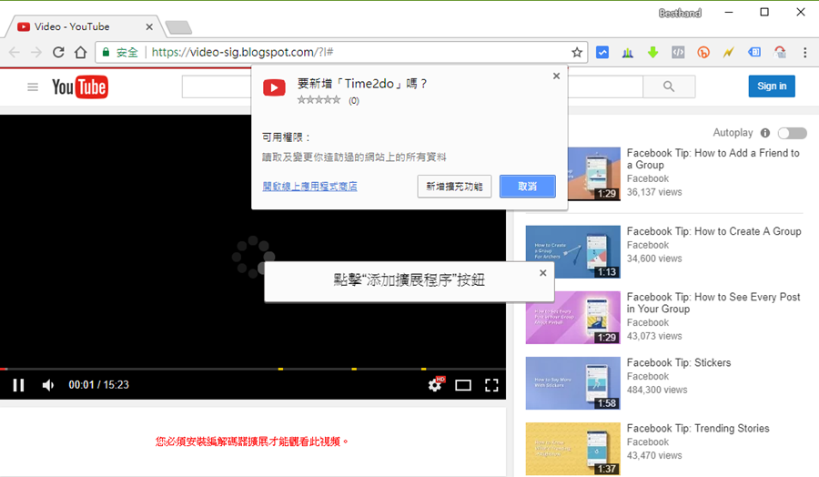 新一波的 Facebook 病毒目前正在網路上大肆宣傳,如果突然收到朋友給你的影片 (且通常預覽會有你的大頭照),那就很可能是病毒。病毒會偽裝成 YouTube 影片播放頁面,並會引誘安裝一個「Time2Do」 Google Chrome 外掛程式,該惡意外掛程式會自動掃描你的 Facebook 好友並且傳送同樣的病毒資訊給朋友。