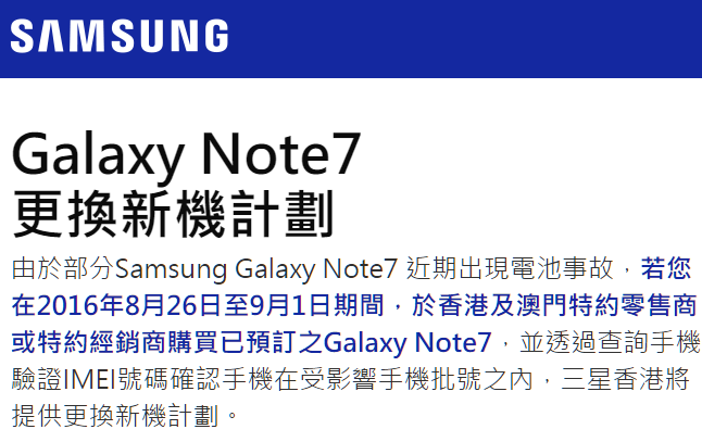 由於 Samsung Galaxy Note 7 電池瑕疵問題,Samsung 已經展開大規模的回收更換新機計畫,目前香港三星也針對此一事件發布更換計畫,香港/澳門消費者只要在 2016年8月26日~9月1日之間於特約零售商或特約經銷商購買的 Note 7 務必立刻進行手機IMEI查詢,若符合更換批號三星將提供新機予以更換。