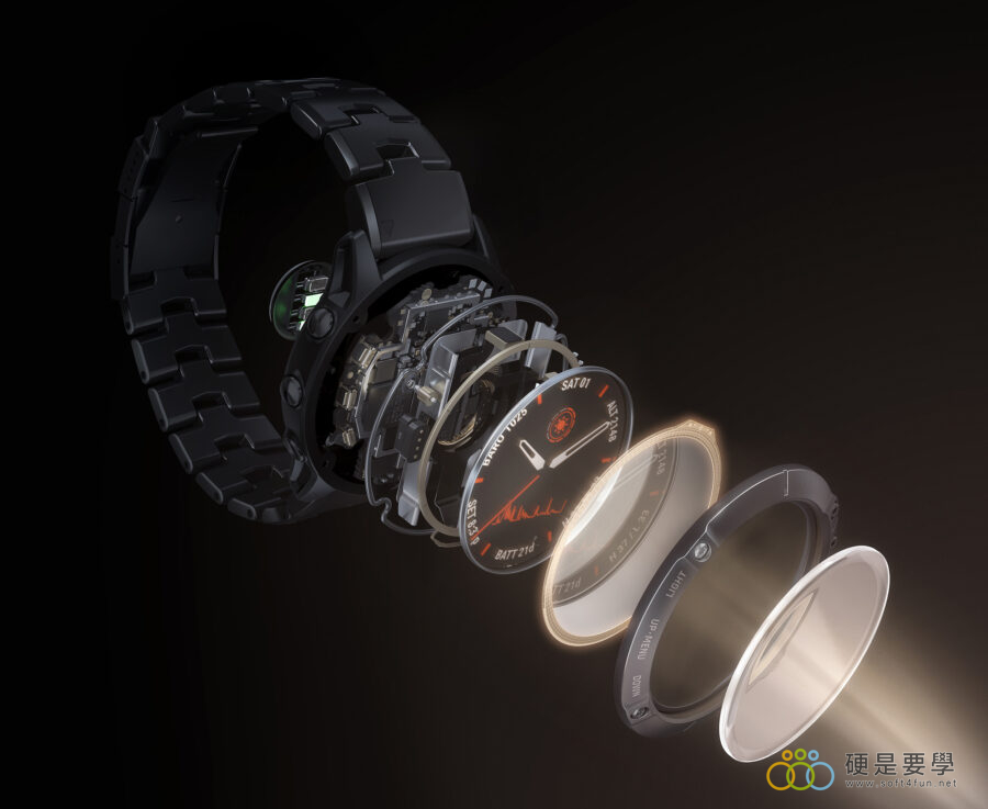 Garmin 這次推出的太陽能充電鏡面技術,直接將導電模組設置在錶面玻璃上,透過 Garmin 的專利技術,錶面看起來不會有黯沉的黑色,且轉換效率還是一般太陽能充電技術的 5 倍,就算被遮蔽 90% 面積,還是能夠提供手錶電量持續發電。
