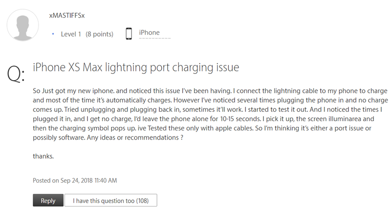 根據 Apple 支援社群上的問題內容,該使用者表示他剛購入新的 iPhone Xs Max 在大多數使用情況下插上充電線會自動充電,但有幾次卻無法正常充電,他測試了幾個方法後認為可能是充電埠或軟體的問題,問題發表後在該留言下有 108 個使用者表示有遭遇相同的問題。
