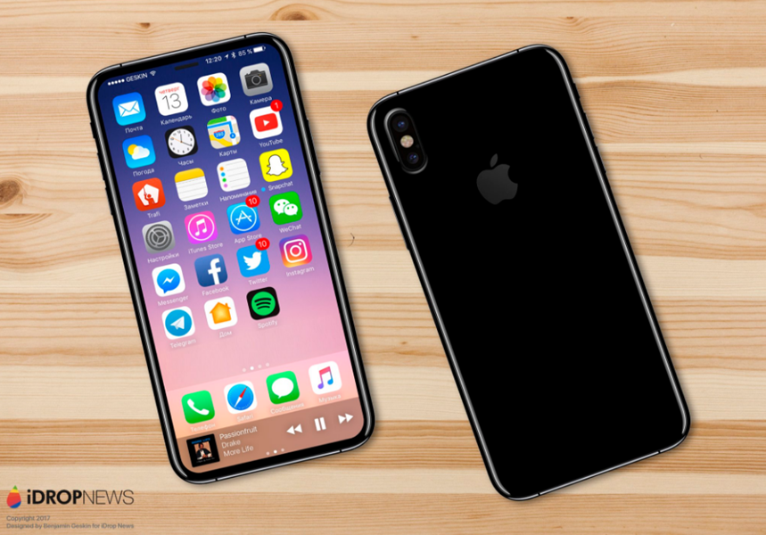 下圖是其中一派將 Touch ID 隱藏到螢幕下放,並且透過在面板下藏紅外線 LED 的方式作為新的 Touch ID 感應方法,從圖片中可以看到鏡頭、聽筒、距離感應器的位置布局都設計在螢幕上方而且相較於 iPhone 7 來得更為緊湊。背面具有雙鏡頭設計,但配置方式由左右調整為上下,補光燈放在兩顆鏡頭中間。