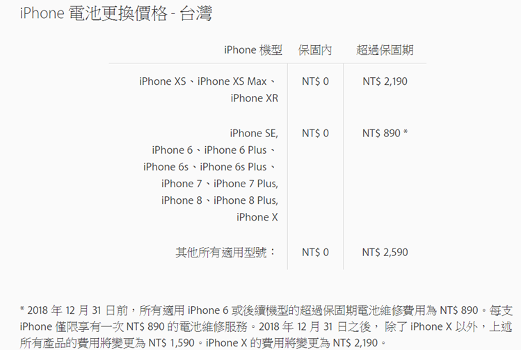 這項政策將在 2018/12/31 變更價格,除了 iPhone X 之外所有產品將會調整為 1,590 元(調高 700 元),iPhone X 電池費用則調整為 2190 元,想要送修的民眾可以向各地的 Apple 授權維修地點洽詢,把握最後 7 天時間。