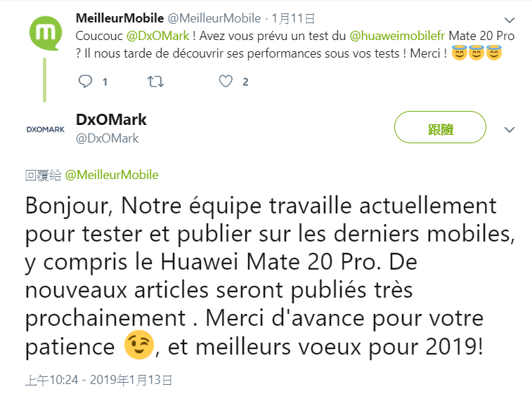 回過來說,DxOMark 看到推文後也在 Meilleur Mobile 的推文下方留言:「目前團隊正在測試新手機,包括華為 Mate20 Pro,新文章即將發布」,雖然沒有明確的給予時程,但總算讓大家等到睽違已久的評測,你覺得會給幾分呢?