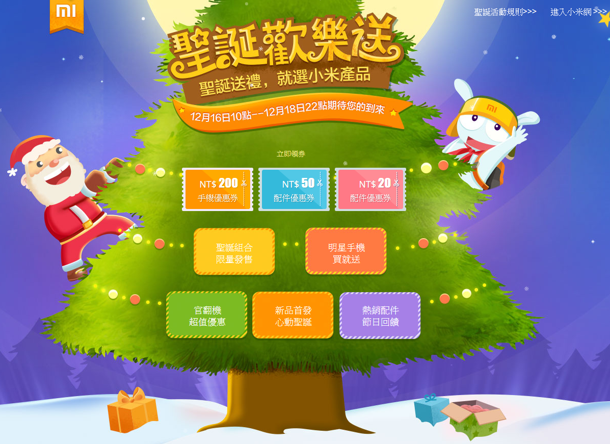 小米慶祝聖誕節的優惠活動從今天(16日)開始囉!不論是想買最新的小米手環光感版、小米手機、平板、行動電源或是其它周邊商品千萬別錯過這次活動,為了讓大家搶便宜,除了產品特價之外還發放200元手機優惠券與50元配件優惠券,熱賣的明星手機降幅更達千元,想要搶便宜手機的話也有一批”官翻版”(官方翻新版)手機、平板大出清,撿便宜就趁這波啦!
