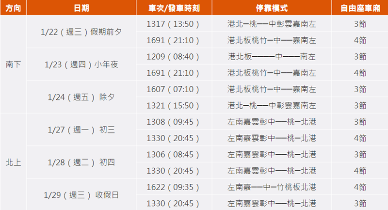 次外,因應春節疏運,高鐵從 1/21~1/30 之間的車次自由座箱數都會因應調整,可參考官方的自由座車箱數公告,而在除夕、初四、初五南下晨間時段和初四北上的深夜時段,有部分車次會配置 10 節對號車箱(11、12節維持自由座),購票前先了解車班座位安排。