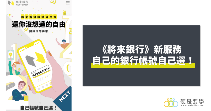 要轉帳給朋友,但卻連自己的銀行帳號都記不住,以後這個狀況可能就不會再發生了!即將開行的網路銀行《將來銀行》推出帳號自由選服務,現在就可以到官網預約客製化自己的銀行帳號,不管你要 888、666 都可以自由發揮,不妨現在就上線預約你的專屬帳號吧!