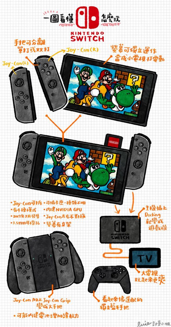 一圖看懂!任天堂SWITCH怎麼玩:4段變形搶先看 ContentParty 9 年前 昨天公開的任天堂新遊戲機NINTENDO SWITCH引起遊戲界不小的騷動,在僅僅3分多鐘的影片中,我們看到了任天堂未來的遊戲機走向,那就是掌機、主機二合一的設計思維,加上過去強調的多人遊玩特性,打造出與現在PS 4、Xbox One完全不同的遊戲特性。但在影片中看到任天堂把SWITCH變來變去,到底SWITCH有幾種遊戲模式呢? 4段變形的遊…