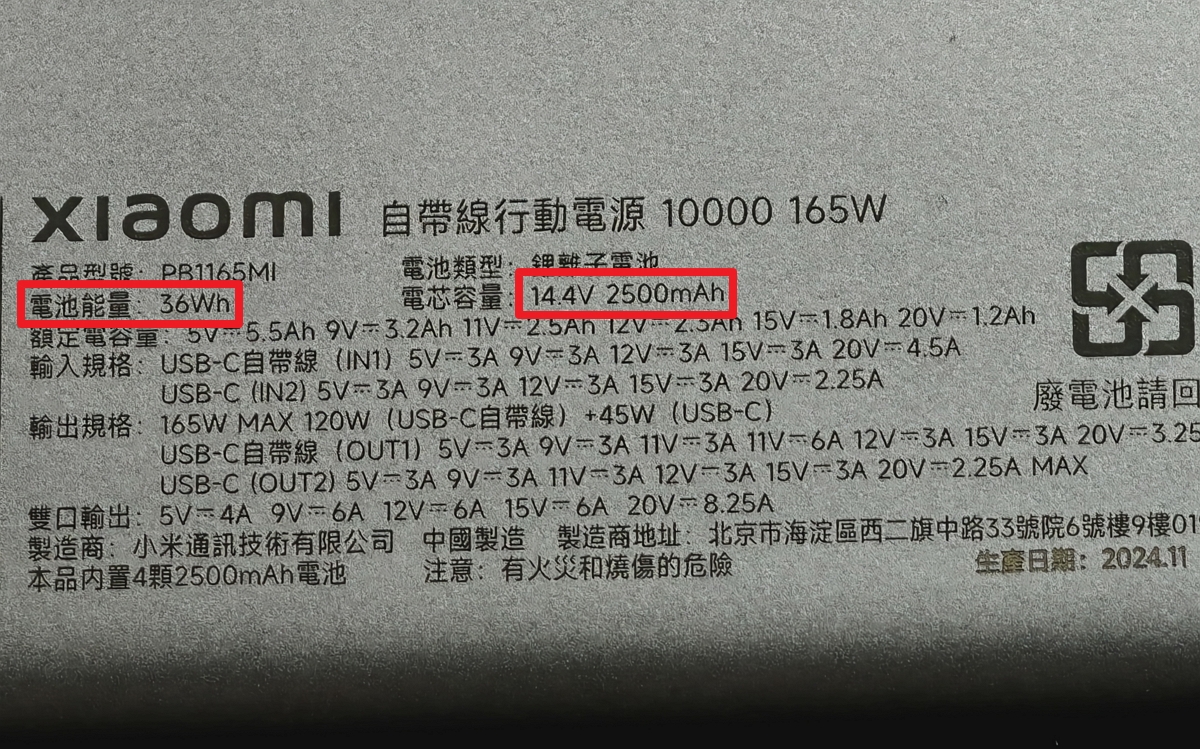 就以小米最近推出的 Xiaomi 自帶線行動電源 10000 為例,在電池上很明確標記電池能量為 36 Wh,電芯電壓為 14.4V (伏特),這些資訊都可以讓你清楚知道電池實際容量。