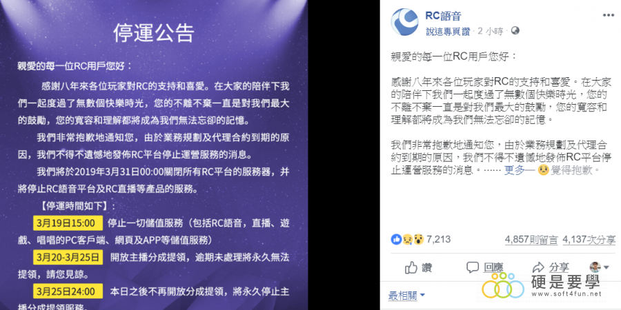 台灣曾經盛行的 RC 語音曾經是語音聊天、唱歌、遊戲、約會常用的平台,但在今天官方公告即將在月底停止營運,原因是業務規劃及代理合約到期,期滿後將會停止所有 RC 服務,包括語音、直播、遊戲、唱唱等,主播的分成提領功能也將在 25 日後永久停止。若尋求替代方案可考慮 Discord (DC語音)。