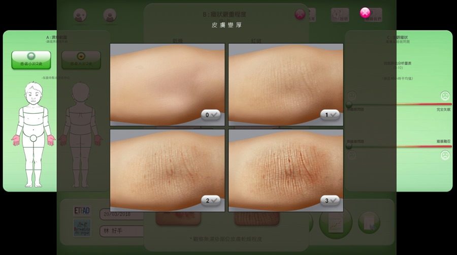 在畫面中依序點選出現過敏症狀的皮膚部位 (正面、背面分開選)、徵狀嚴重程度 (乾燥程度、紅斑、腫脹程度…等,每個都要選) 以及睡眠、搔癢症狀。