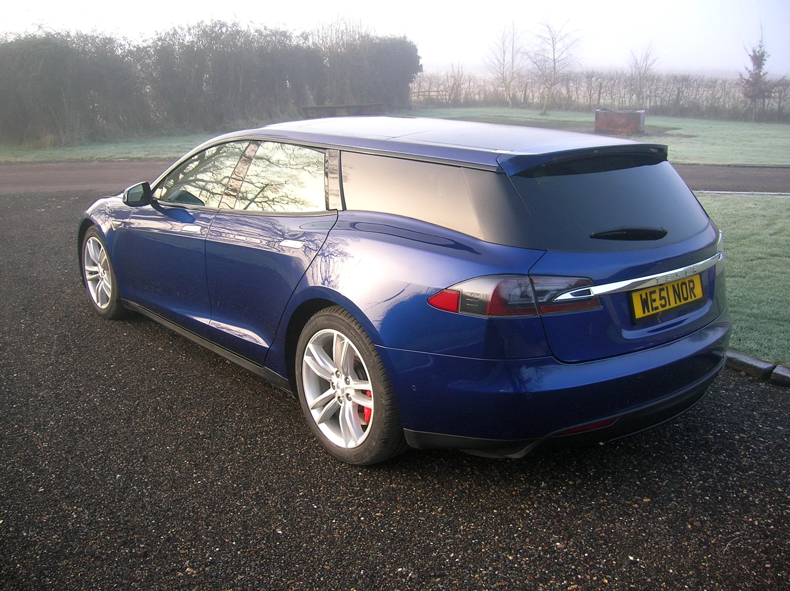 Model S Shooting Brake 是在英國的 Norfolk 地區製造,目前已經有照片流出這部 Model S Shooting Brake 已經完成,B 柱之後線條上揚直到車尾,車尾燈具整體線條與原先的 Model S 相同,整體無違和感,若不知道的人,還以為是 Tesla 自己推出的新車型,完成度超高!