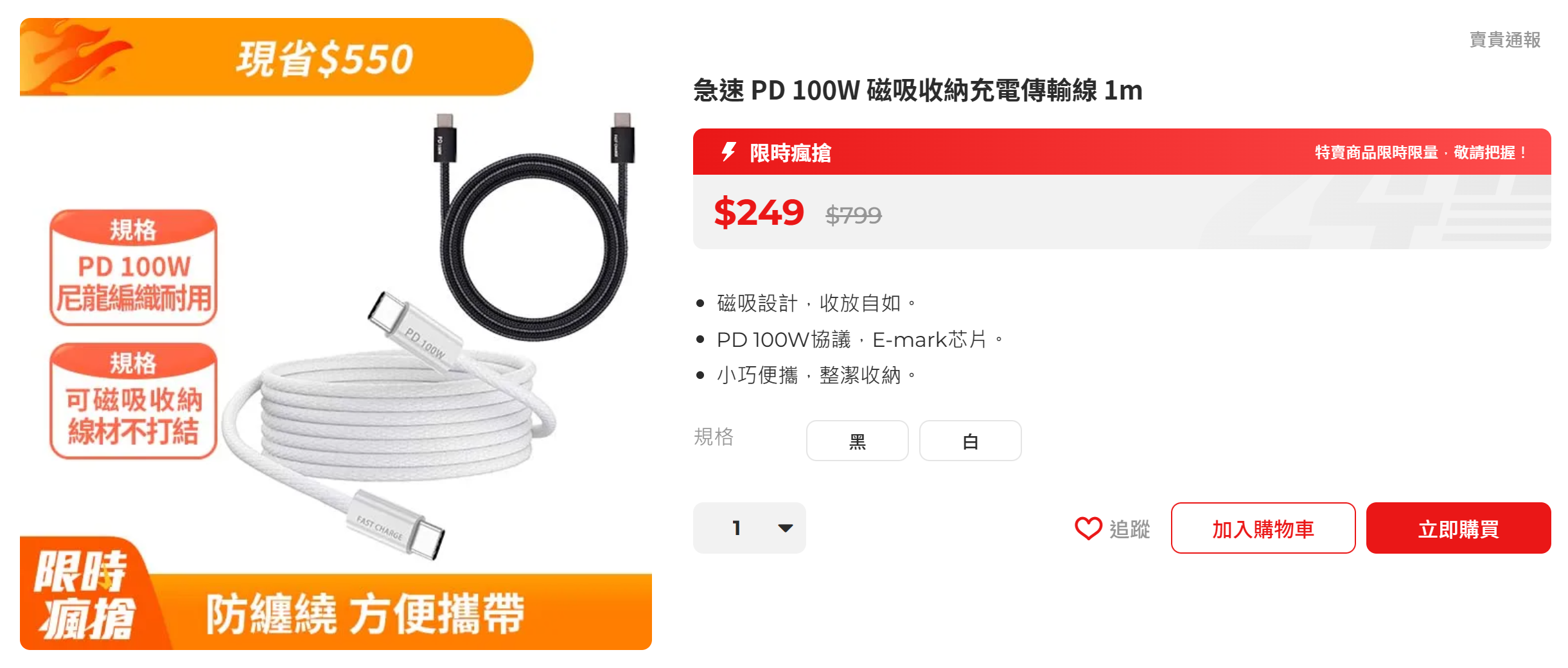 如果你正在尋找一條具備 100W 大瓦數的充電線,那麼現在正是時候!PChome 24h 「急速 PD 100W 磁吸收納充電傳輸線 1m」支援 100W USB-PD 快充協定,線材還具備磁吸功能方便收納,輕鬆整線不打結。商品價格原價 $799 元,目前限時只要 $249 元 (31 折)。