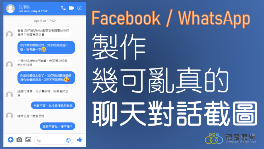 輕鬆產生假的 Facebook 聊天畫面超簡單,別再自己拼湊啦! Werboy 7 年前 想要做一張幾可亂真的 Facebook 對話截圖不用手動拼貼,線上工具產生一下就好。Fake Chat App 顧名思義是一個產生偽對話截圖的服務,不過他不是 App 而是一個網頁,它可以產生 WhatsApp 或 Facebook Messenger 的對話畫面,並且可以自訂對方的照片、名稱、雙方對話訊息(可用圖片、表情等),輕鬆就能產生對話截圖。 製作出來的假聊天截圖,你分得出來真假嗎? 製作教學影片