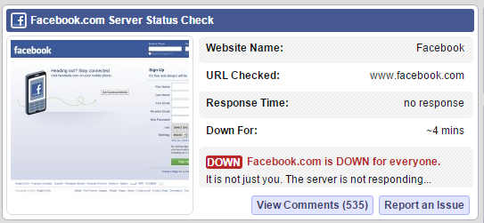 當你點開上面的連結進入網站後會看到如下圖的介面,如果 Respones Time 欄位顯示 no reponse 代表網站目前沒有回應,所以這張畫面的內容已經證實了 Facebook 目前是掛點狀態,而且持續了大約 4 分鐘。