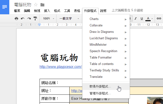 當然,唯一的限制就是大家都要在自己的 Google Drive 文件中安裝「 Collavate 」這個外掛,下面,就讓我實作一遍給大家參考。