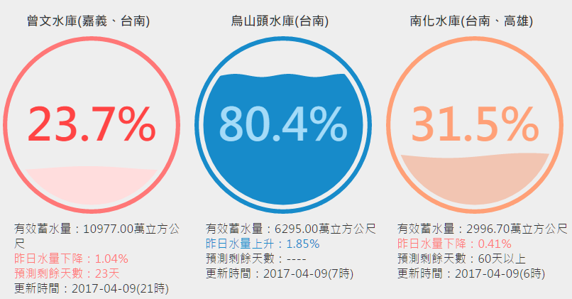 即時水情網站裡面有全台各地的水庫蓄水狀況,顏色藍色代表蓄水量非常足夠,以目前北部的翡翠、石門水庫來說,蓄水量還算足夠,而在蓄水量下方的資料裡面有水量上升或下降的趨勢,如果是紅字(水量下降)的話會估算剩餘可使用的天數。