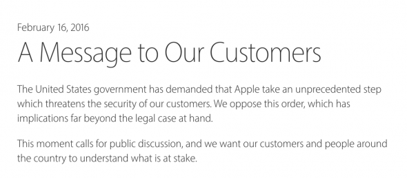 庫克公開信(全文翻譯):為維護用戶安全拒開後門,即便違抗政府命令也在所不惜 客座投稿 10 年前 圖、文/蘋果仁 FBI 在調查去年十二月在美國發生的槍擊案,要求 Apple 解鎖其凶手 Syed Rizwen Farook 的 iPhone。美國政府要求蘋果提供「必要的技術協助」來解鎖凶手的 iPhone 5C,因為蘋果的安全性功能妨礙了辦案人員的調查。但蘋果執行長拒絕了這項要求,表示此舉將… 更多Apple相關報導Apple 正式發表 M5 晶片!升級了什麼? 一次整理給你!買二手iPhone前必看!怎麼判斷買家有多「操」這隻手機?電池保養秘訣iOS 26 正式開放下載更新,全新 Liquid Glass 液態玻璃設計歐盟要求蘋果開放 AirDrop、AirPlay,並在今年底完成AirPods 4 帶來 "看不見" 的改版,現在更好戴了,而且還支援主動降噪!